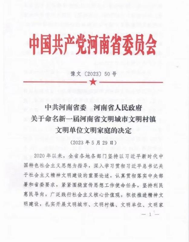 近日,中共河南省委、省政府下發(fā)《關(guān)于命名新一屆河南省文明城市文明村鎮(zhèn)文明單位文明家庭的決定》(豫文〔2023〕50號),..