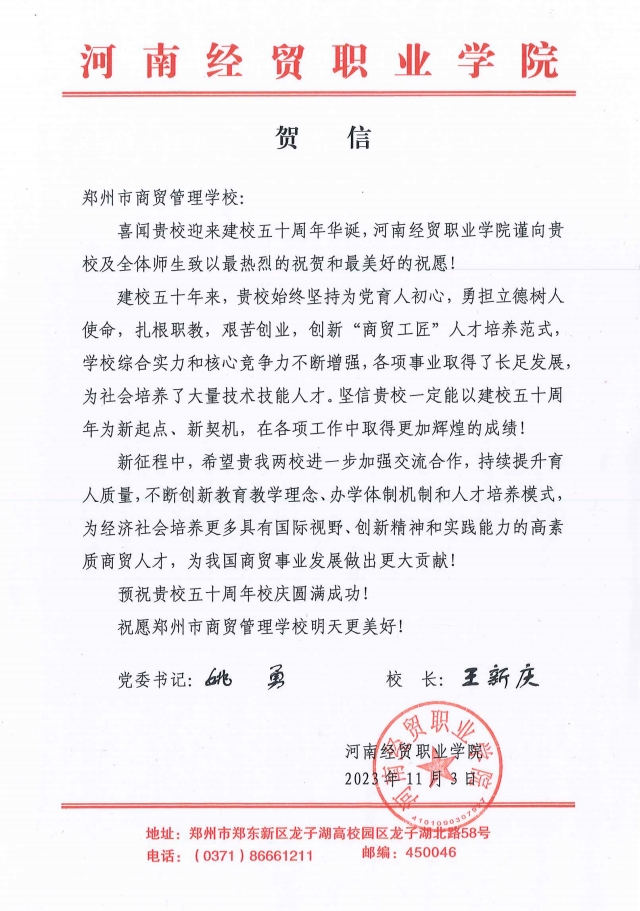 河南經(jīng)貿(mào)職業(yè)學(xué)院賀信